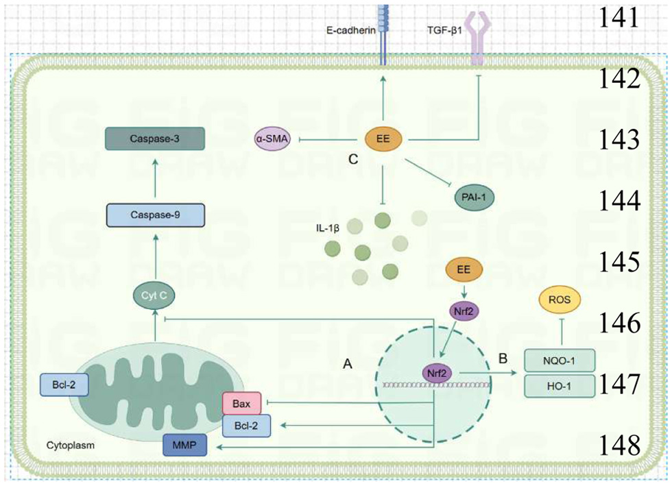 ![]() Click for large image | Figure 1. Mechanisms by which EE alleviates pulmonary fibrosis and liver fibrosis. (a) EE inhibits Bax expression, promoted Bcl2 expression, alters mitochondrial membrane potential, and inhibits cytochrome c release and Caspase-3/9 expression. (b) EE promotes Nrf2 nuclear translocation, promoted downstream NQO-1/HO-1 expression, and inhibits ROS levels. (c) EE inhibits the expression of TGF-β1, α-SMA, PAI-1, IL-1β and promoted the expression of E-cadherin. |