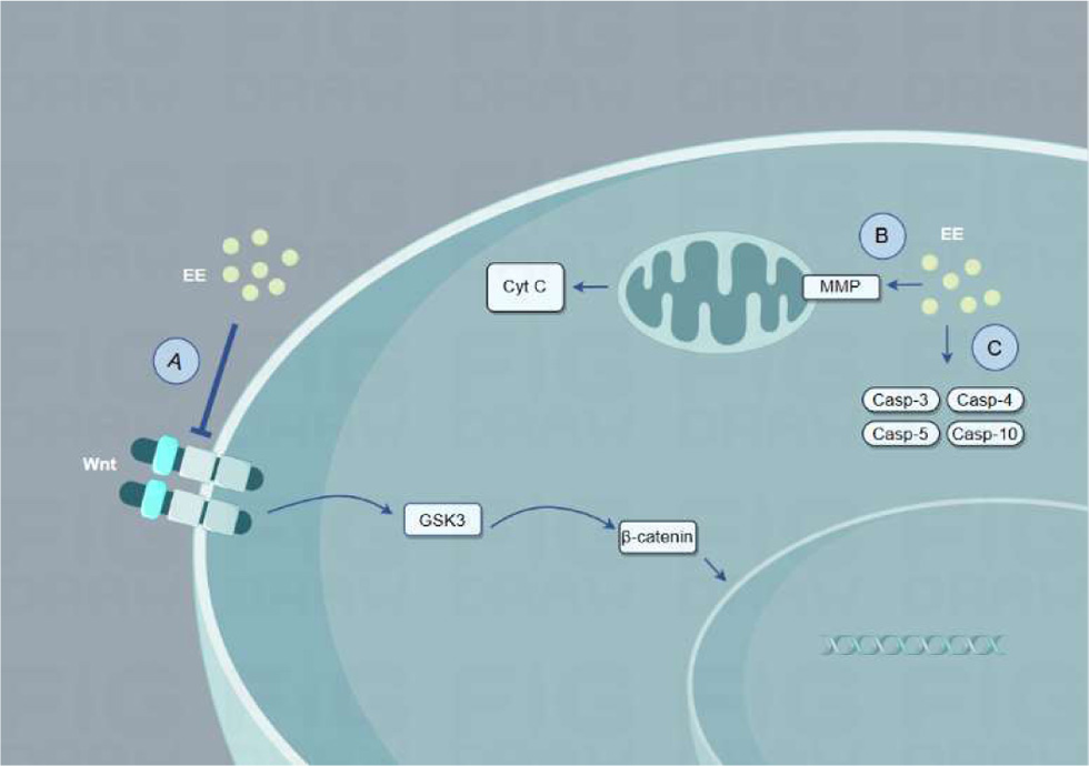 ![]() Click for large image | Figure 2. The mechanisms by which EE promotes apoptosis of cancer cells. (a) EE inhibits wnt/β-catenin pathway. (b) EE alters mitochondrial membrane permeability and releases cytochrome c. (c) EE promotes the expression of caspase3/4/5/10 in the cells. |