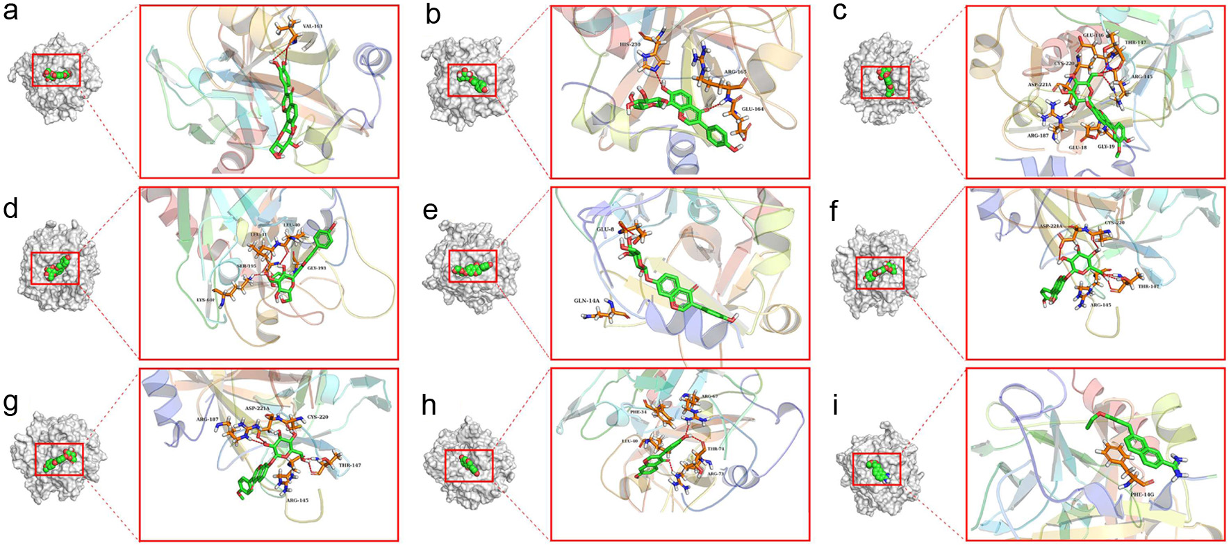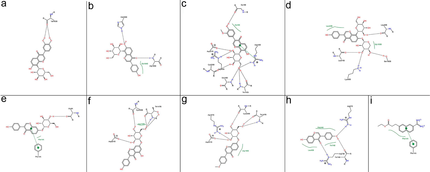 Thrombin plays a pivotal role in thrombogenesis, thrombin inhibitors are used in the treatment of thrombotic diseases (Liu et al., 2010). As shown in Table S1, the eight components in Puerariae Radix showed stronger inhibitory activity against thrombin, when the DCH [name: 3-(7-diaminomethyl-naphthalen-2-yl)-propionic acid ethyl ester] positive control exhibited a binding energy value of −5.8 kcal/mol. Among these components, ononin showed the strongest inhibitory activity against thrombin. The interactions between thrombin and inhibitors was shown in Figs. 1 and 2.