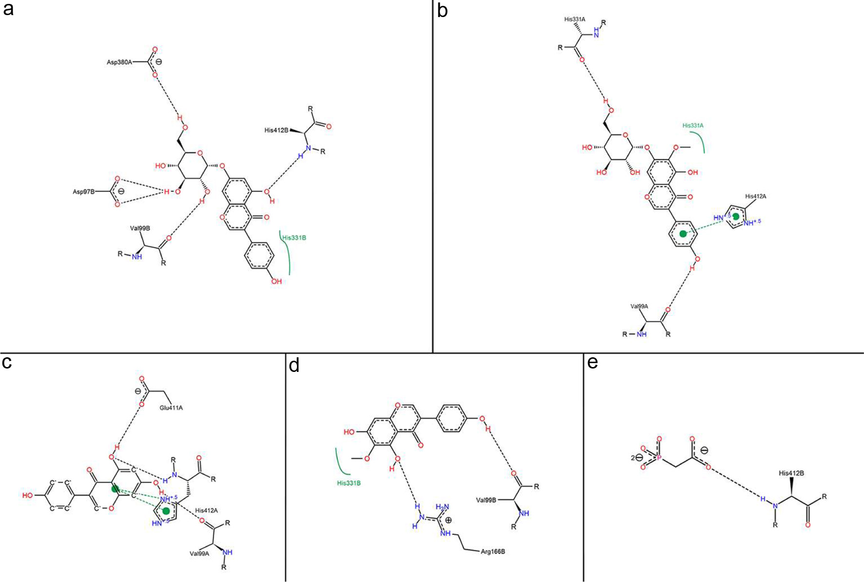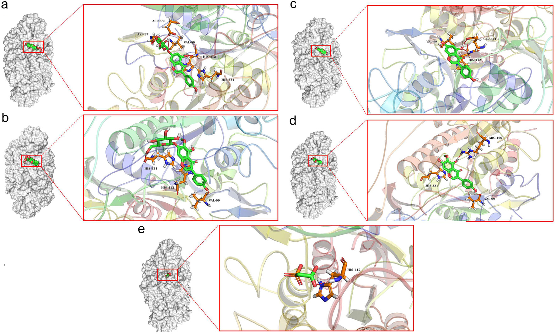 Previous studies have suggested that excessive alcohol intake is associated with increased alkaline phosphatase activity (Balasubramaniam et al., 1988). Inhibition of alkaline phosphatase was critical to the detoxification of alcohol. The four components in Puerariae Flos were potent alkaline phosphatase inhibitors with respective binding energy values of −6.6 kcal/mol, −6.8 kcal/mol, −7.1 kcal/mol and −7.6 kcal/mol. PAE (name: phosphonoacetic acid) was used as a positive control, and its binding energy value with alkaline phosphatase was −3.8 kcal/mol (Table S2). Among these components, genistin showed the strongest inhibitory activity against alkaline phosphatase. The interactions between alkaline phosphatase and inhibitors was shown in Figs. 3 and 4.