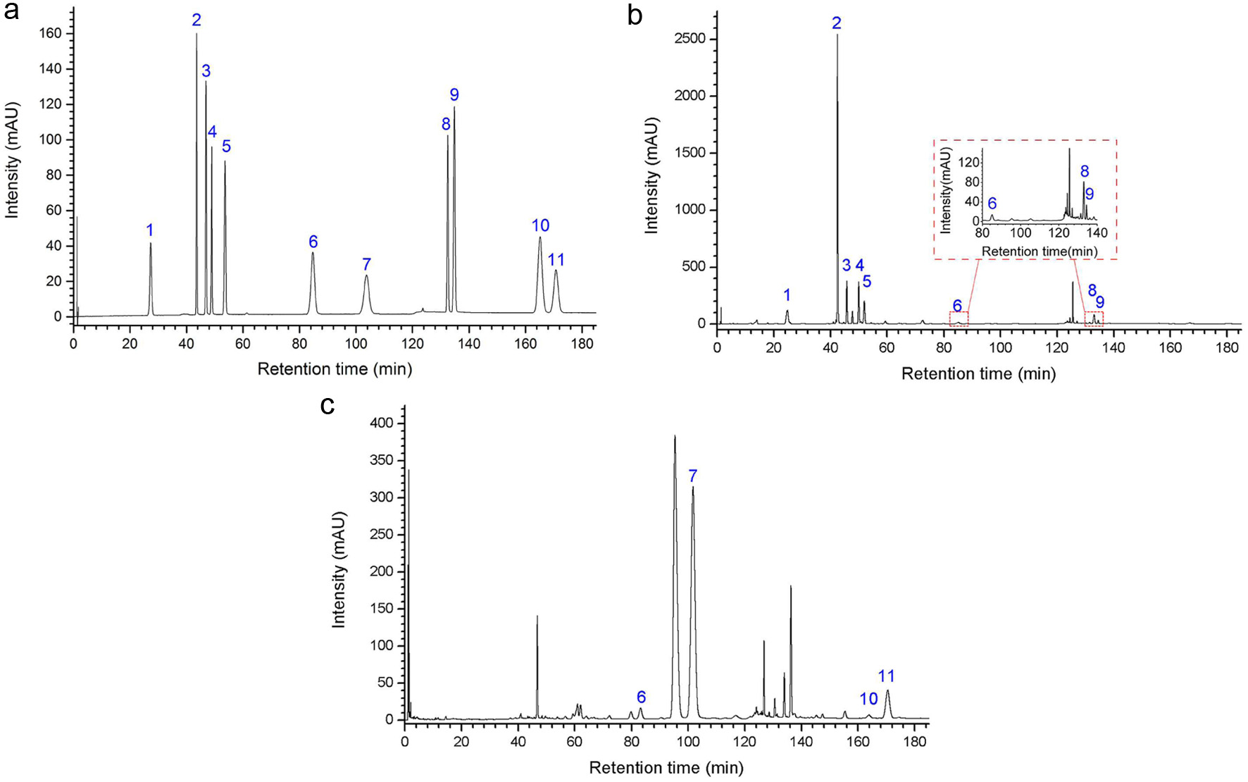 The quantitative analysis was carried out on a Waters-Acquity UPLC system equipped with the auto sampler, binary gradient pump, and PDA detector. Chromatographic data were collected and evaluated using Empower 3 software. The chromatographic separation was carried out using a Kromasil C18 column (2.1 × 100 mm, 1.8 µm, 100 Å) along with the detective wavelength of 210 nm. The mobile phase consisted of 1% formic acid in water (A) and acetonitrile (B). The gradient elution program was 6% B (0–35 min), 6–10% B (35–38 min), 10% B (38–118 min), 10–19% B (118–121 min), 19% B (121–191 min). The flow rate was set at 0.20 mL/min and the column temperature was held at 25 °C. The sample volume injected was 1.0 µL.