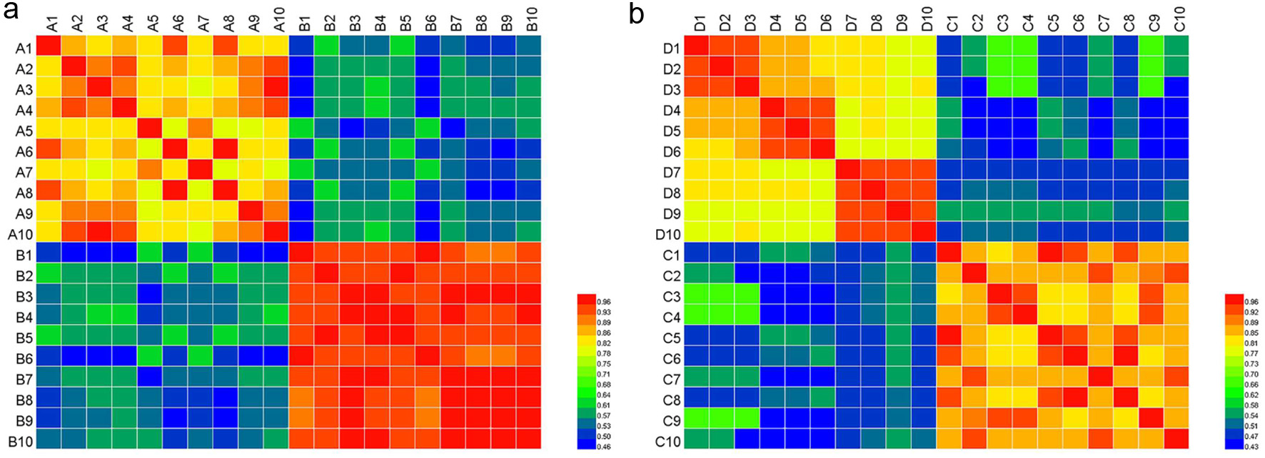 Based on these findings, SA was further performed using the contents of the eleven important peaks as input data. Results of SA are shown in Fig. 6, a low correlation coefficient (blue module) indicates a poor similarity between the samples, and a value of the correlation coefficient approaching 1.0 (red module) represents a perfect similarity of the samples. It is easy to see that the similarity value between different species in samples was obviously different. The correlation coefficients between PTR and PLR are ranged from 0.462 to 0.635, and it is ranged from 0.430 to 0.698 between PLF and PTF. In Puerariae Radix, the similarity value between A10 and B6 was the lowest (0.462), compared to other different samples. Similarly, the correlations between C4 and D4 were lower than those of other Puerariae Flos samples.