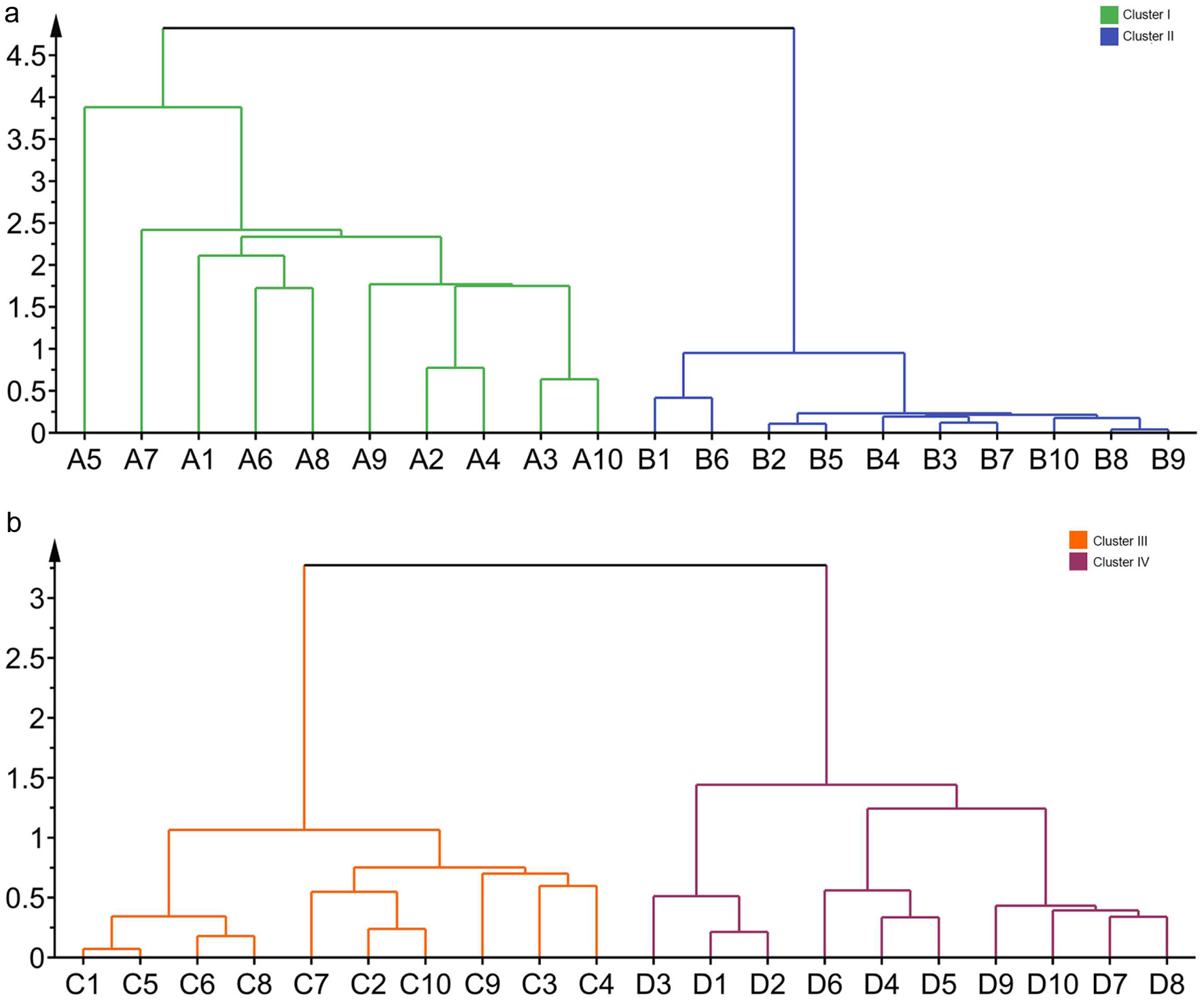 In order to visualize similarities among samples through linkage distances, hierarchical cluster analysis (HCA), an unsupervised learning method, was employed to generate dendrograms according to chemical marker contents of forty batches of Puerariae Radix and Puerariae Flos, respectively. As shown in Fig. 7, either Puerariae Radix or Puerariae Flos samples could be clearly classified into four regions in terms of species. Clusters I and II were formed by PLR and PTR samples, respectively. Cluster III and IV consisted of PTF and PLF samples, respectively. These results suggested that based on their chemical markers, the Pueraria species of both roots and flowers could be discriminated according to their species using QAMS analysis and hierarchical cluster analysis. The result was in accordance with those provided in the SA study, the same species collected from the different regions could not be separated by HCA. It was shown that the environmental stimuli or growth place of influence in the chemical profiling is extremely limited.