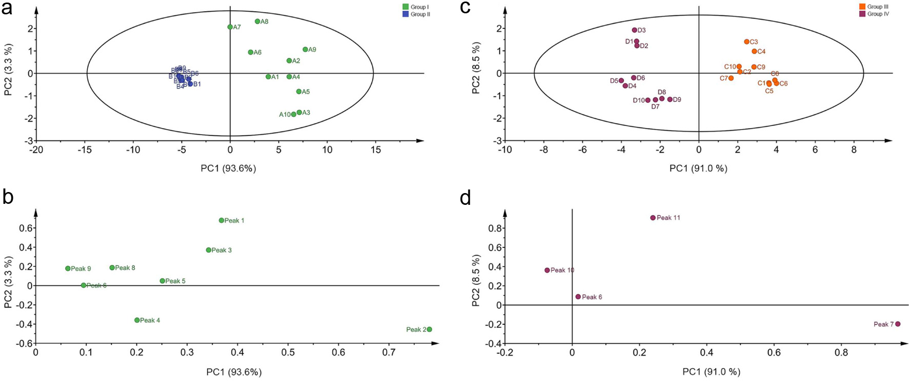 Group I consisted of PLR samples, group II consisted of PTR samples, group III and group IV consisted of PTF and PLF samples, respectively. These findings were in good agreement with the HCA results. It is well-known that the phytochemical levels of herbal medicines can be affected by geographical factors (e.g., soil, temperature and rainfall) besides the species (Lv et al., 2016). However, the PCA score plot showed that the species is still the most important factor with respect to the effect on phytochemicals variation of Puerariae Radix and Puerariae Flos samples compared with geographical factors.