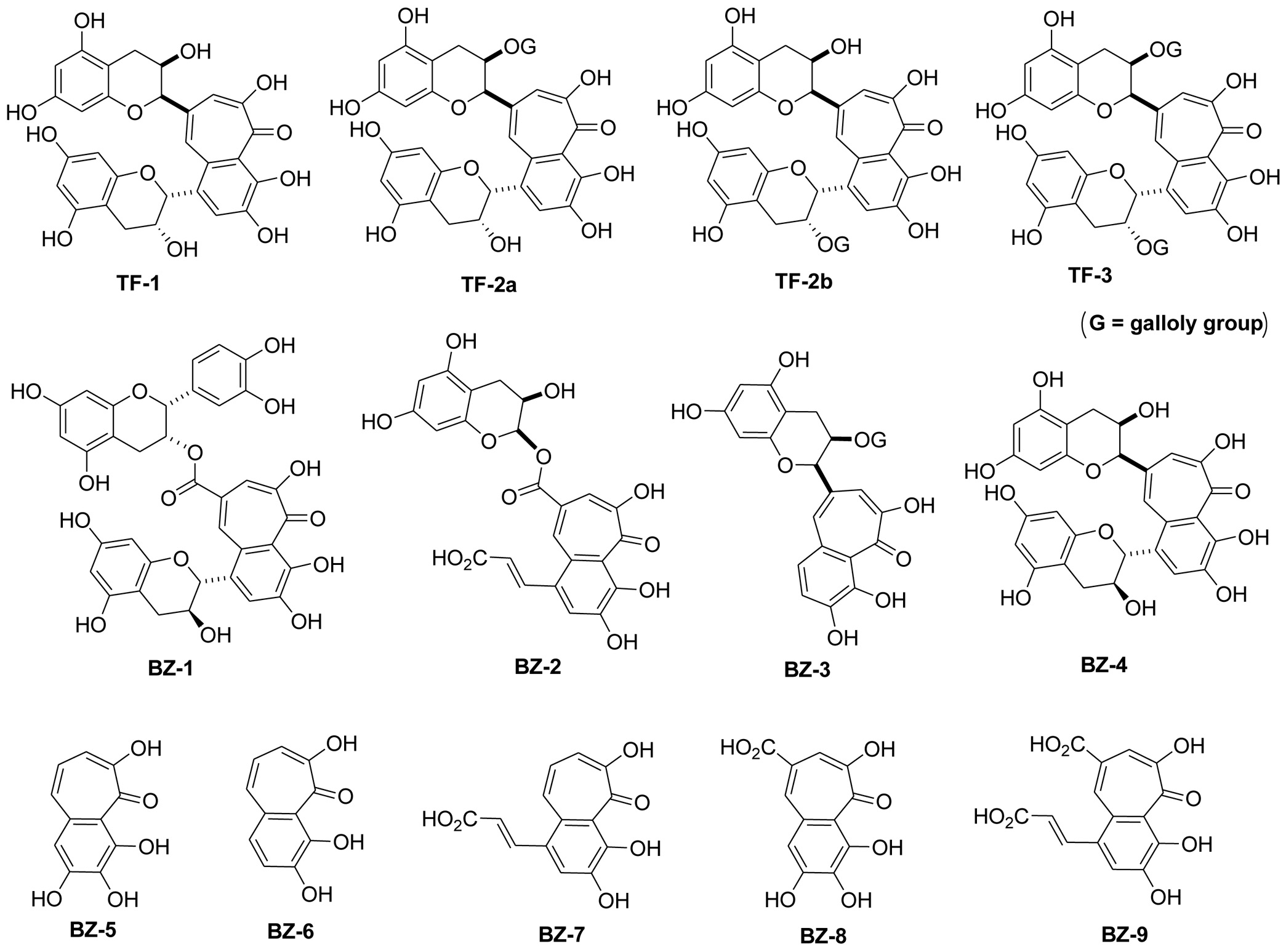 ![]() Click for large image | Figure 1. Structure of benzotropolone derivatives. Structures of the nine different benzotropolone derivatives (BZ-1 to BZ-9) are illustrated. For comparison, the four theaflavin isomers such as theaflavin (TF-1), theaflavin-3-O-gallate (TF-2), theaflavin-3′-O-gallate (TF-2′) and theaflavin-3,3′-O-O-digallate (TF-3) with the benzotropolone moiety as their core structure are also shown. |