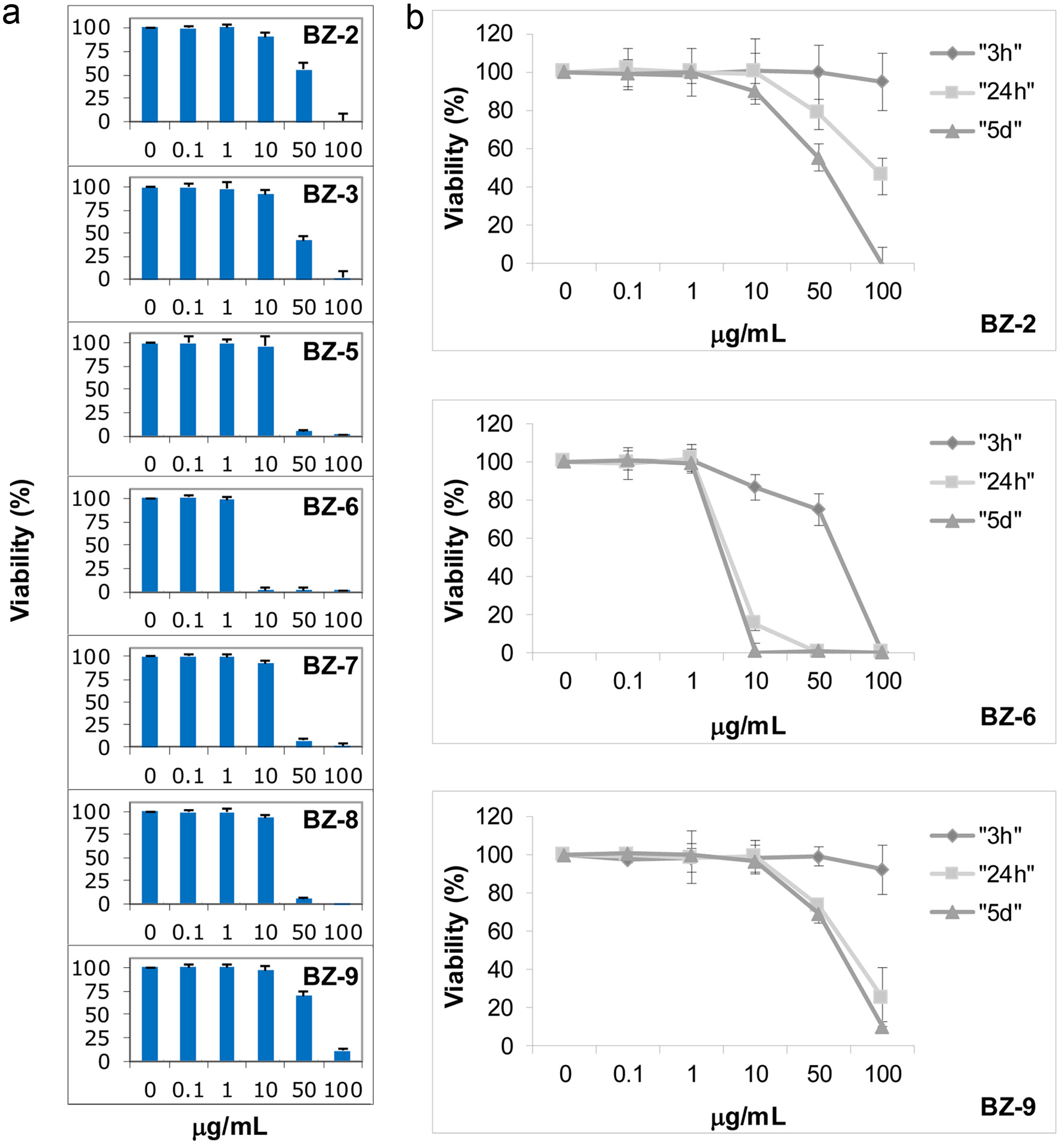 We then performed a more detailed dose response and kinetic analysis of three benzotropolone derivatives representing either a high molecular weight molecule showing low cytotoxicity (BZ-2) or low molecular weight derivatives showing strong (BZ-6) or low cytotoxicity (BZ-9) after 5 days of exposure, respectively (Figure 2a). Dose response analysis was performed in the range from 0.1 - 100 µg/mL after 3 h, 24 h, and 5 days of exposure (Figure 2b). As expected, we observed an increase in cytotoxicity in response to longer exposure times for BZ-2, BZ-6 and BZ-9. BZ-6 exhibited strongest cytotoxicity as indicated by IC50 values of around 75 µg/mL (367 µM), 7.5 µg/mL (37 µM) or 5 µg/mL (24 µM) after 3 h, 24 h, and 5 days, respectively. Although we observed similar IC50 values for BZ-2 (around 50 µg/mL) and BZ-9 (around 70 µg/mL) after 5 days due to the difference in molecular weight the IC50 values calculated for molarity are different (e.g. 86 µM and 240 µM for BZ-2 or BZ-9, respectively). Interestingly, after 3h the toxicity profiles of BZ-2 and BZ-9 looked very similar (viability of more than 90% in response to 100 µg/mL) but we noted a difference in the profile after 24 h and 5 days of incubation. Whereas BZ-9 showed stronger cytotoxicity after 24 h as compared to BZ-2 (IC50 of around 75 μg/mL and 100 µg/mL for BZ-9 or BZ-2, respectively), after 5 days the cytotoxic effects of BZ-2 (around 50 μg/mL) were stronger in comparison to BZ-9 (around 70 μg/mL).