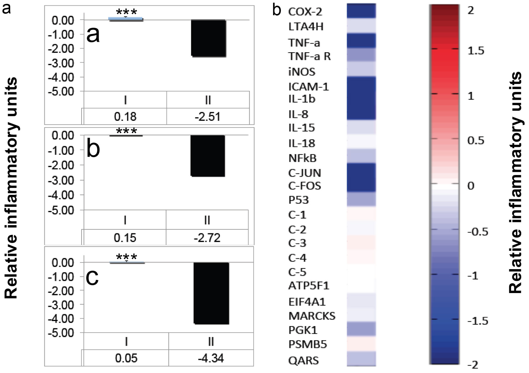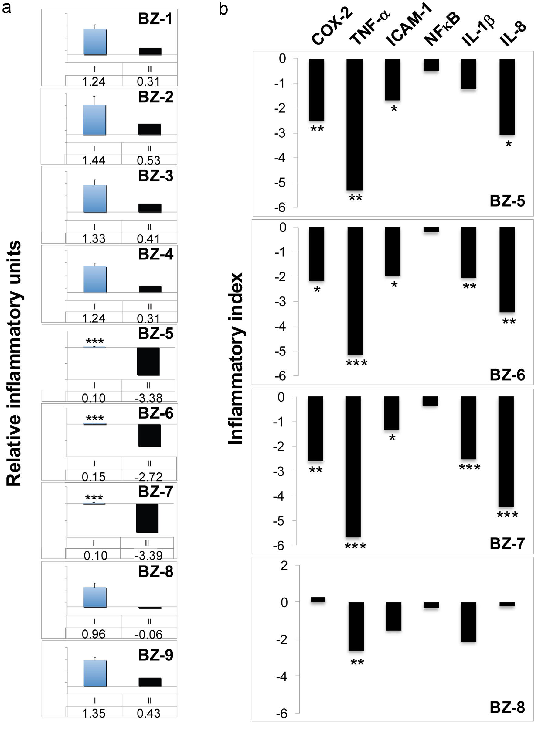 The inflammatory index indicates either pro- or anti-inflammatory effects. It is based on the delta-delta CT method indicating the ratio between experimental (TPA plus BZs) and control channel (TPA alone) normalized to the expression of housekeeping genes. Ratiometric numbers (indicated as fold gene expression) are then converted into log 2 base values (ratios below 1 transform into negative numbers) and expressed as inflammatory index. Based on the inflammatory index, anti-inflammatory potential is indicated by negative numbers, whereas positive index numbers are indicative for pro-inflammatory effects.
